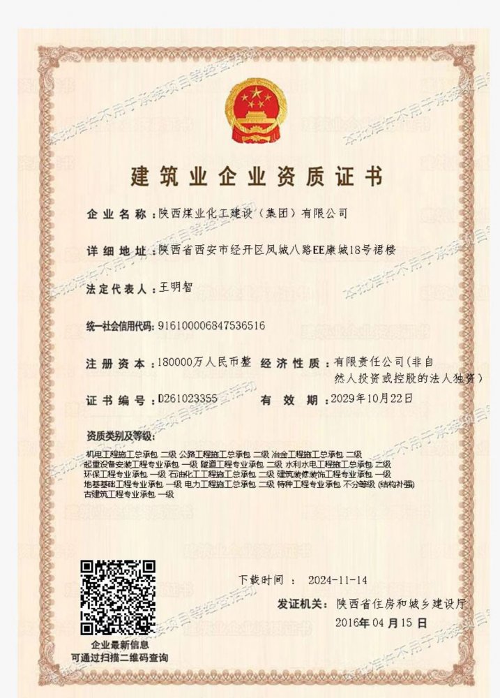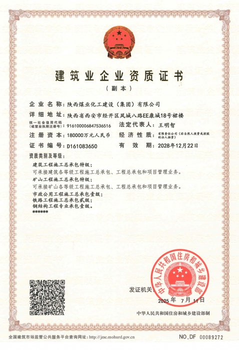 擁有建筑工程施工總承包、礦山工程施工總承包“雙特級(jí)”資質(zhì)和建筑行業(yè)甲級(jí)、煤炭行業(yè)(礦井、選煤廠)專業(yè)甲級(jí)設(shè)計(jì)資質(zhì);市政公用工程、鋼結(jié)構(gòu)工程、起重設(shè)備安裝工程、環(huán)保工程、建筑裝修裝飾工程、地基基礎(chǔ)工程、古建筑工程一級(jí)承包資質(zhì);機(jī)電工程、公路工程、冶金工程、鐵路工程、水利水電工程、石油化工工程、電力工程、隧道工程二級(jí)承包資質(zhì),同時(shí)具有特種工程專業(yè)承包資質(zhì)。
